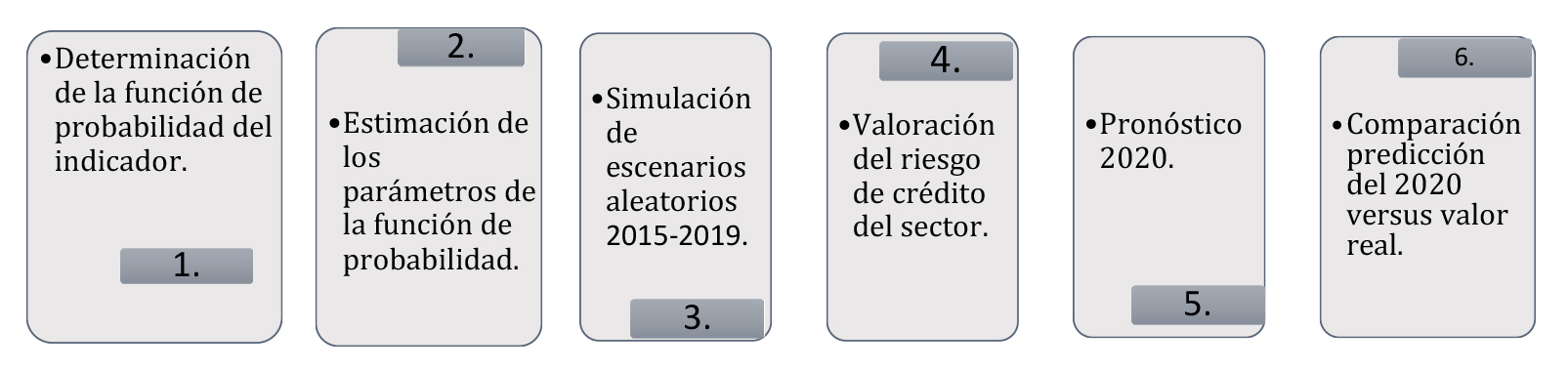 En tercer lugar, se presenta la metodología utilizada, la cual se encuentra soportada en el modelo Montecarlo y la metodología International Scoring, FICO, en la que, a partir de estas, se obtuvo una calificación de riesgo para cada sector de la economía, la cual fue contrastada con un estimado real de la información financiera del 2020.