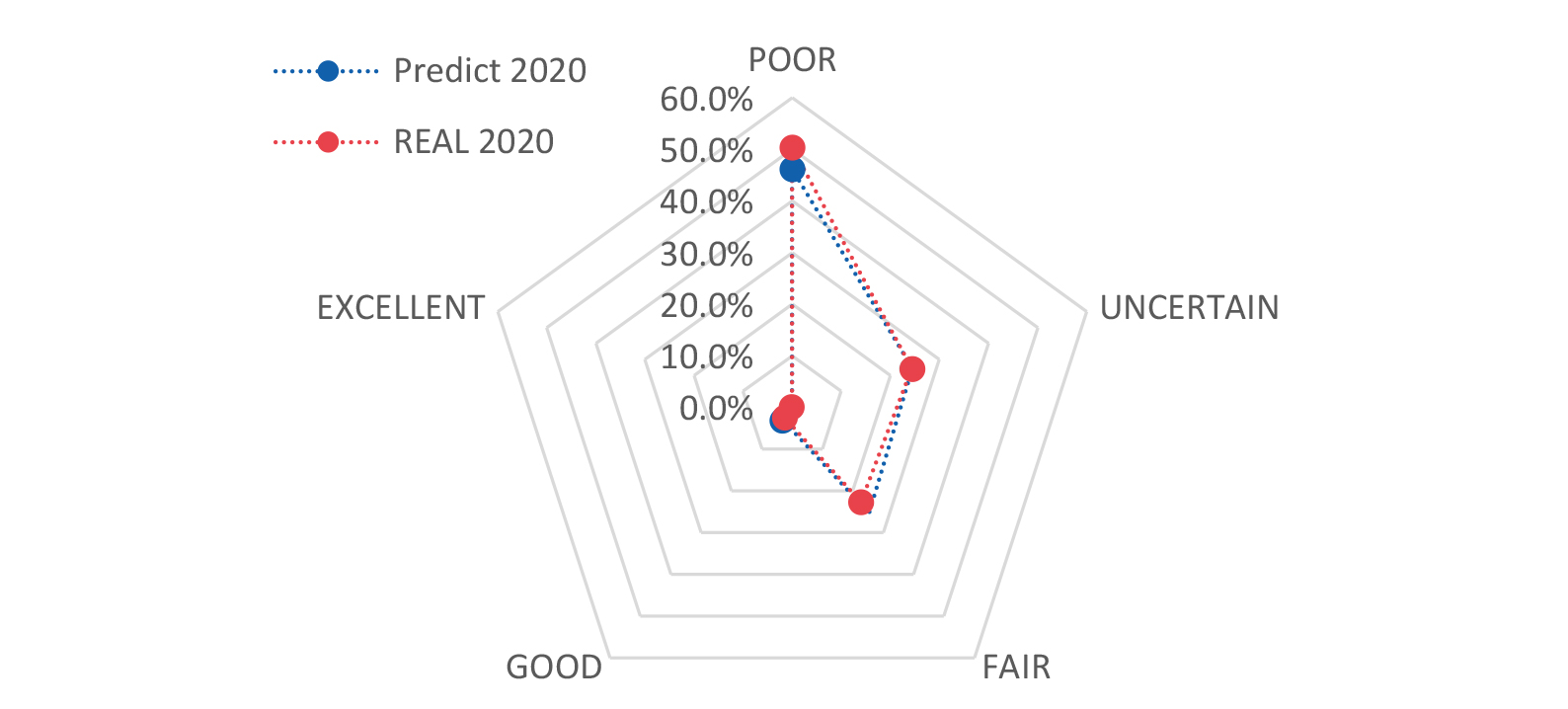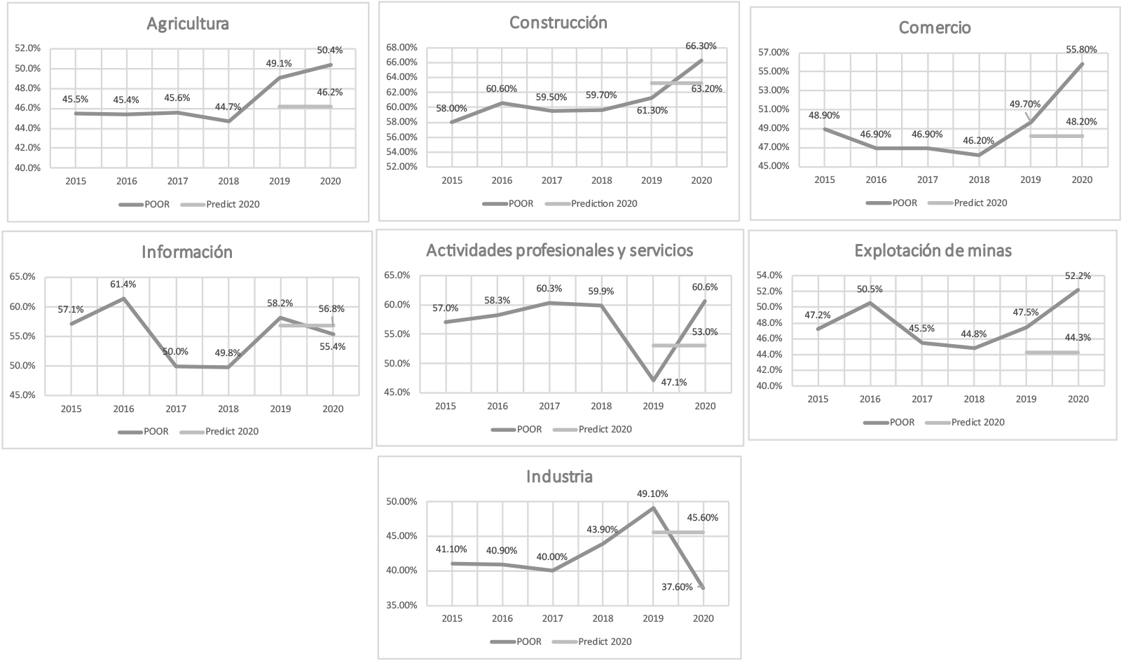 En la escala de valoración de riesgo FICO, la medición pobre significa un riesgo alto, y excelente, un riesgo de crédito bajo. Así, los resultados que se observan (véase la figura 5) permiten predecir para el 2020 una calificación del sector de la siguiente forma: pobre del 46,2 %, incierto del 24,5 %, justo del 25,4 %, bueno del 3 % y excelente del 0,062 %. Al calcular los indicadores financieros y validar la información real obtenida para el 2020, se evidencia un incremento considerable en la probabilidad de riesgo en la medida en que la calificación pobre incrementa al 50,4 % y la excelente disminuye al 0,055 %.
