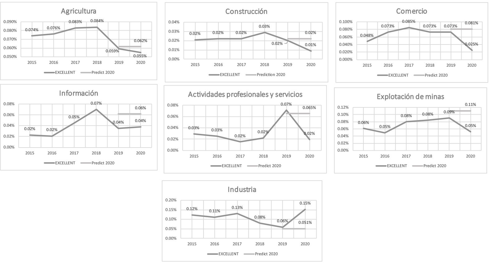 La figura 4 presenta la calificación de riesgo como resultado promedio de los sectores que reflejaron peores resultados de riesgo producto de la pandemia. En cuanto a la percepción de riesgo, el sector agricultura presentó un nivel de riesgo promedio máximo en el 2020 del 0,055 %, aunque las cifras antes de pandemia preveían un riesgo máximo del 0,062 %; a su vez, el sector construcción presentó un riesgo máximo del 0,01 %, mientras las proyecciones prepandemia indicaban el 0,02 %; el sector comercio presentó el 0,025 % respecto al 0,081 %; el sector información el 0,04 % en comparación con el 0,06 %; el sector de actividades profesionales el 0,02 % respecto al 0,065 %; la explotación de minas el 0,5 % en comparación con el 0,11 %; y el de industria el 0,051 % respecto al 0,15 %.
