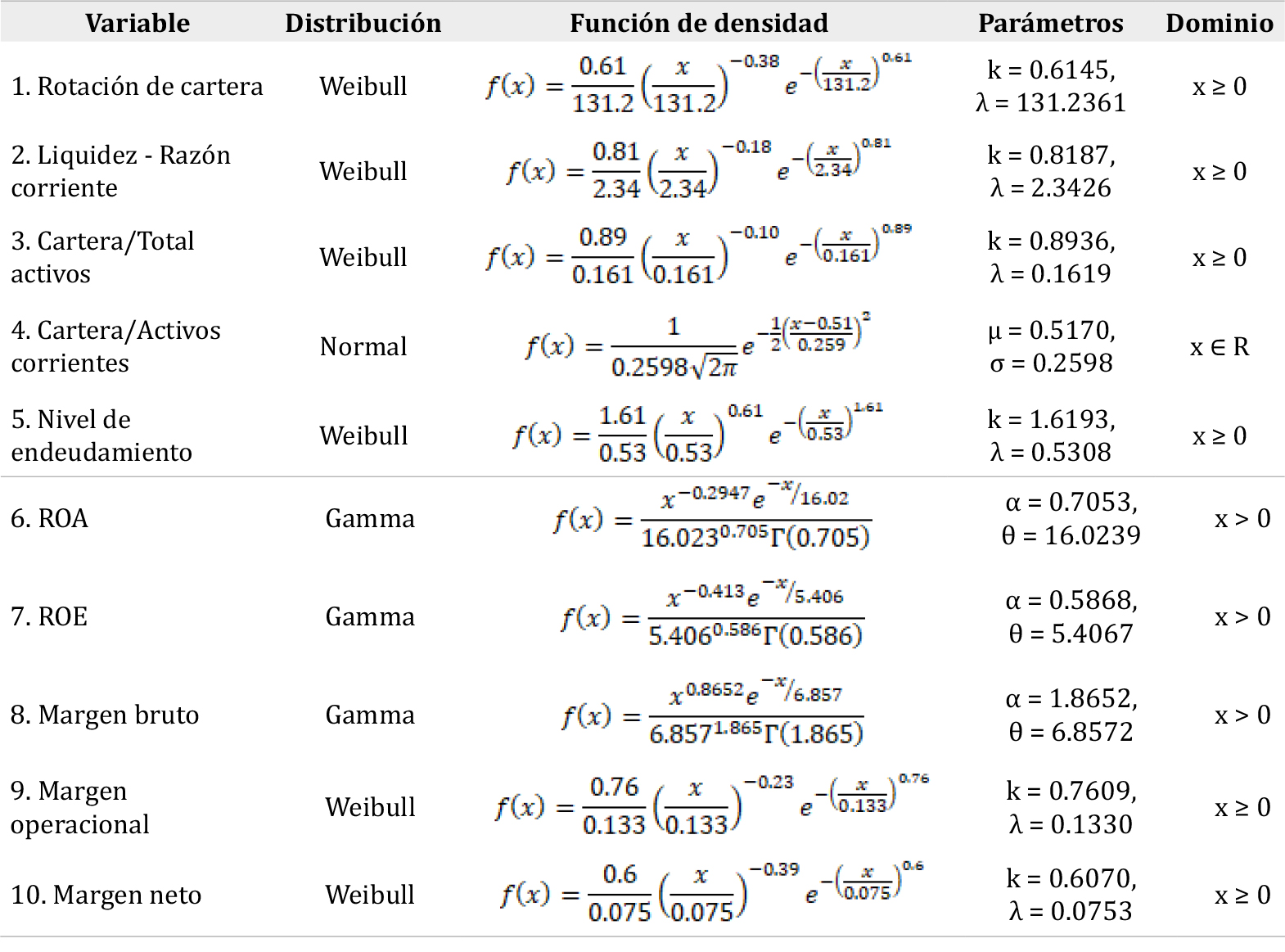 El modelo está soportado a partir de lo considerado por Delgado-Vaquero et al. (2020), quienes aplicaron un modelo para calificación de riesgo sombra mediante la utilización de ratios financieros a diferentes empresas listadas en bolsa de valores. Dicha calificación fue calibrada mediante un escenario sombra frente a las calificadoras de riesgo de mercado, con lo cual se obtuvo una alta correlación y se creó confianza en la utilización de ratios financieros como datos de entrada en este tipo de modelos.