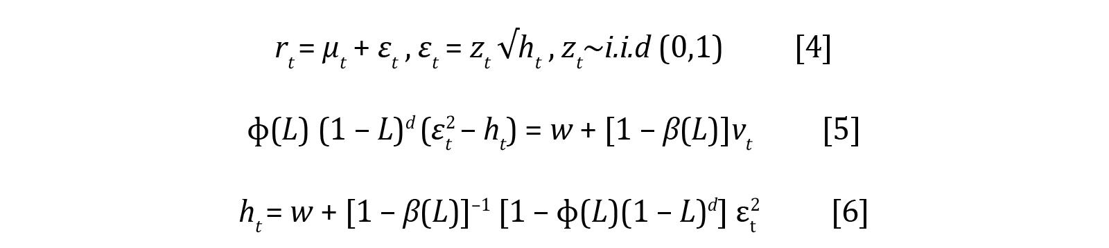 Where ht is the conditional variance, L is the lag operator, w is the constant, ɸ(L) and β(L) are lag polynomials in order q and p, 0 ≤ d ≤ 1 is the fractional integration parameter.