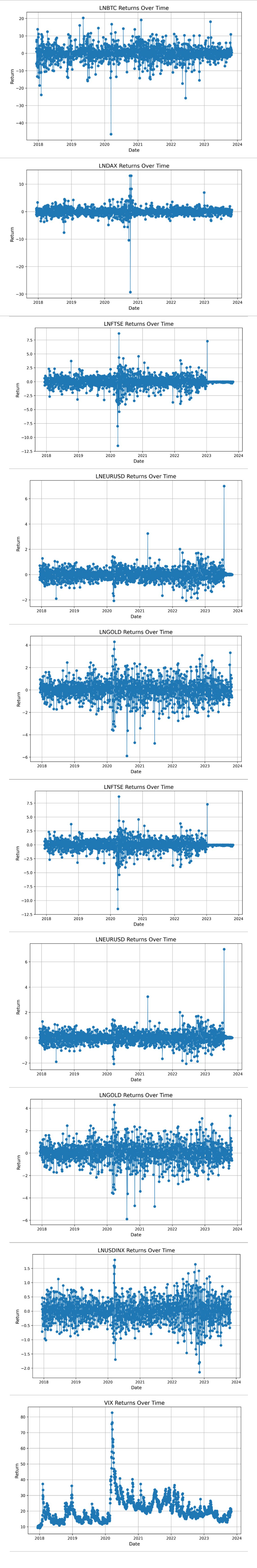 n return 100 to all variables except for the VIX. This transformation stabilizes the variance, reduces the impact of scale differences across assets, and produces a return series suitable for time series analysis. The VIX is an indicator of implied volatility that measures the market's expectations for 30-day volatility in the S&P 500.