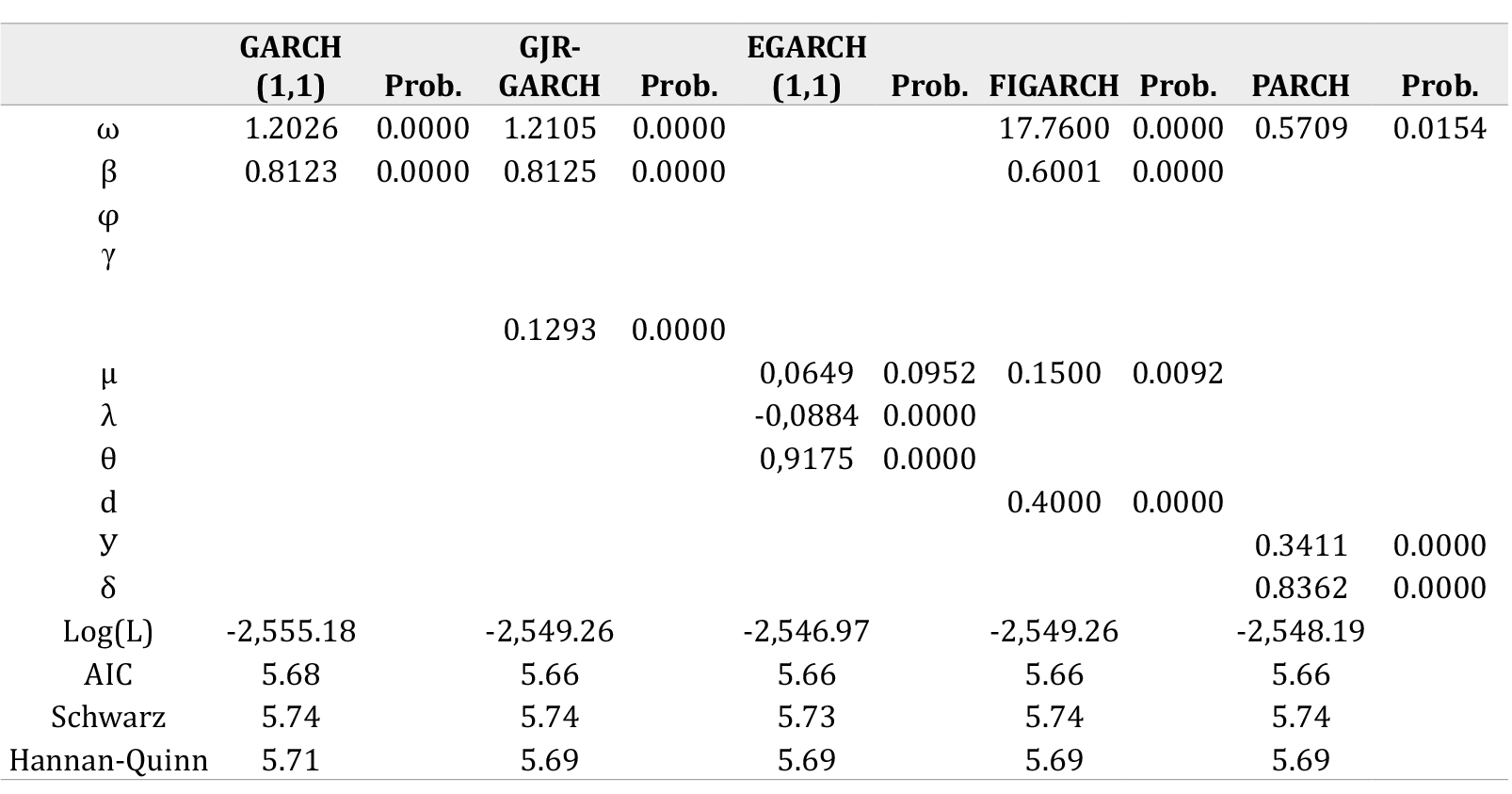 Where ht is the conditional variance, δ ≥ 0 power parameter, w > 0, ai. > 0, βj. > 0, γi. is the asymmetry (leverage) parameter, if y. >0, negative shocks increase volatility more than positive shocks of the same magnitude.