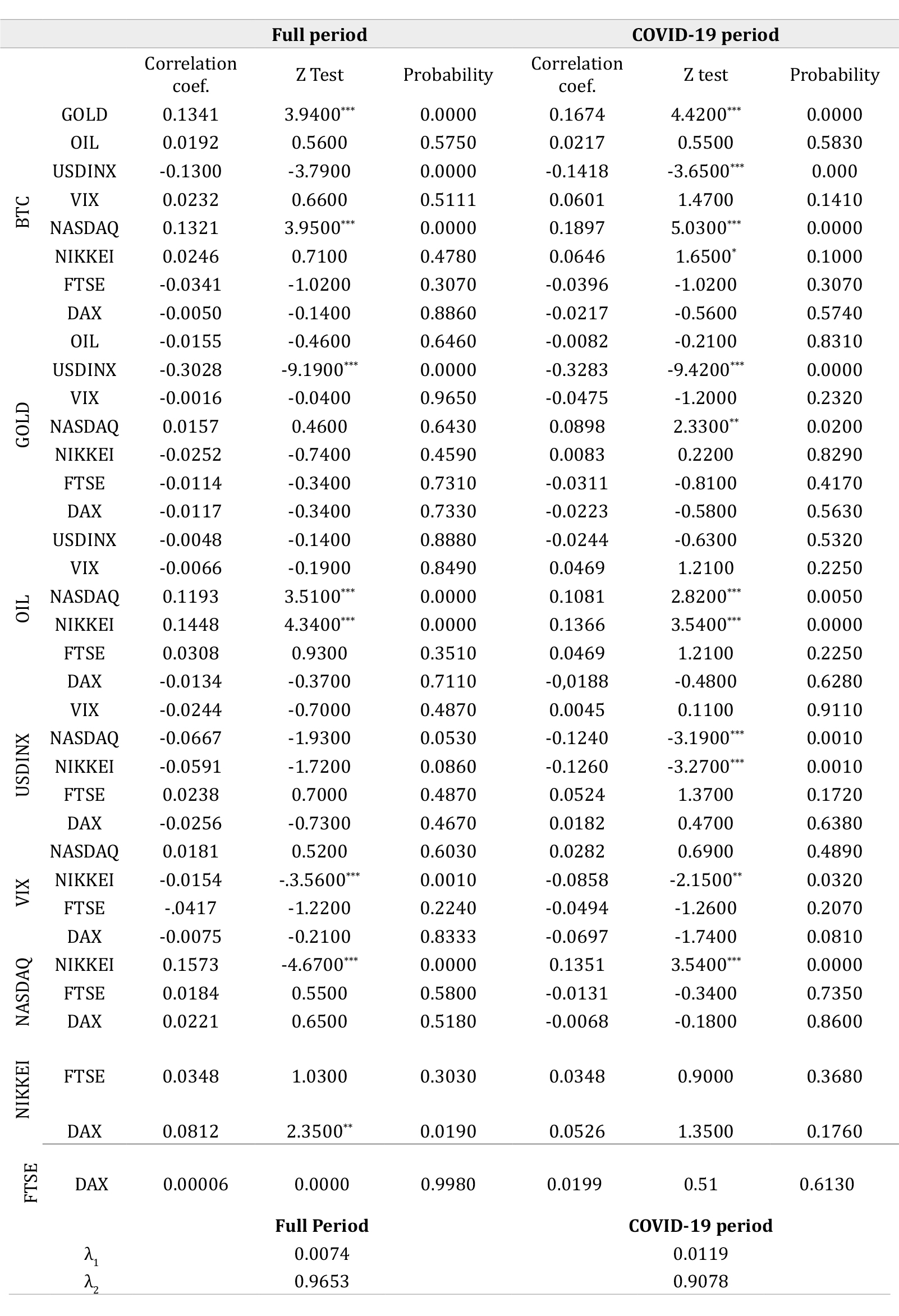 Although investigating the interrelationship between BTC and other financial instruments is the motivation for this research, we primarily focused on the relationship between the BTC financial and commodity markets. The relationships between BTC and other financial and commodity markets are examined for the COVID-19 period and for all periods and presented in Table 9. The purpose of defining the time interval is to determine whether the COVID-19 period has an impact on the relationship between the variables.