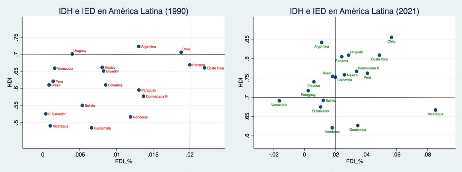Figura 3 Correlación entre el IDH y la IED por países en América Latina, 1990-2021