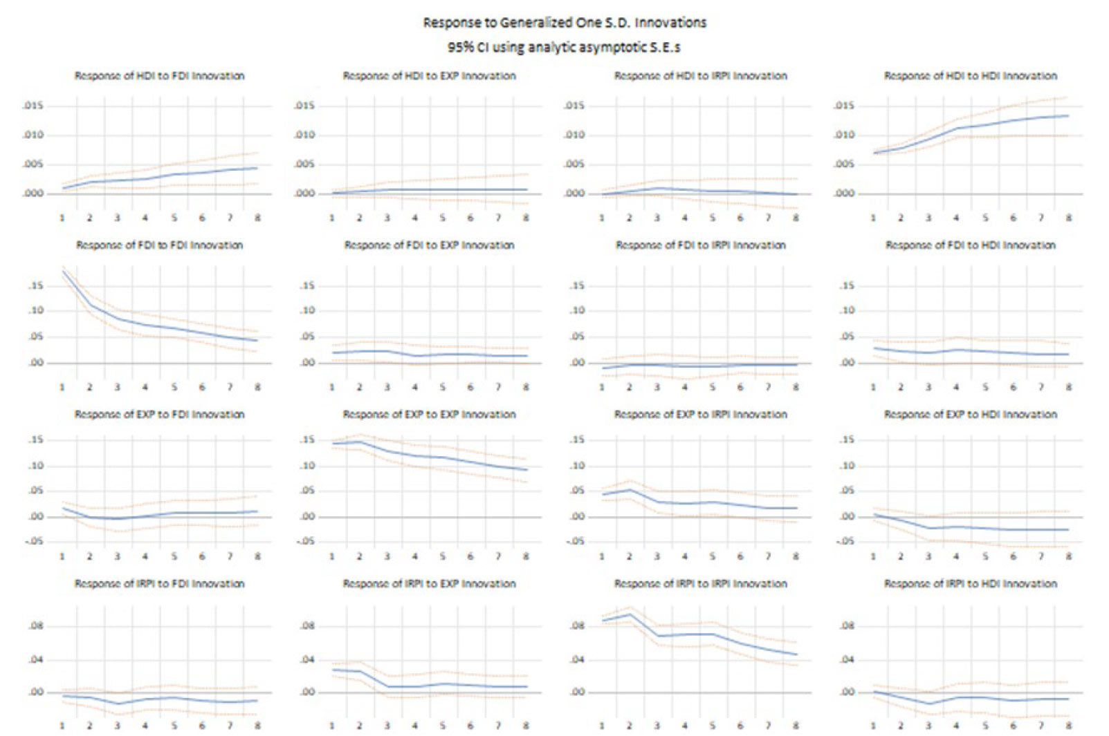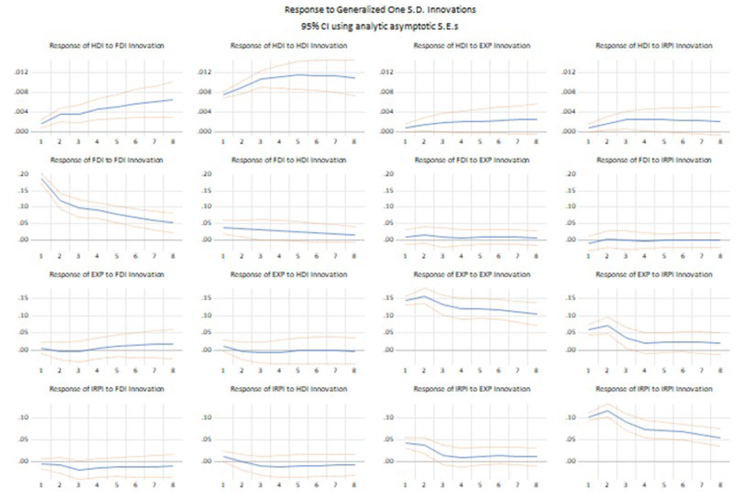 En las modelaciones del PVAR se incluyeron variables no estacionarias (el IDH, las exportaciones y el IRPI), sin embargo, como se mencionó previamente, mantenerlas sin diferenciar permite conservar su componente de largo plazo que es fundamental para analizar la relación entre desarrollo e inversión extranjera (véase el anexo 1 con las pruebas de raíz unitaria). Así mismo, se incluyeron cuatro rezagos en el PVAR_1 (muestra completa) y tres rezagos para el PVAR_2 (muestra minero-energética), según la prueba de orden de criterio de selección (véase el anexo 2), lo cuales resultaron siendo significativos (véase el anexo 6). Adicionalmente, las raíces invertidas computadas de las estimaciones fueron menores que 1 (véase el anexo 4) y se rechazó la autocorrelación de los rezagos (véase el anexo 5).