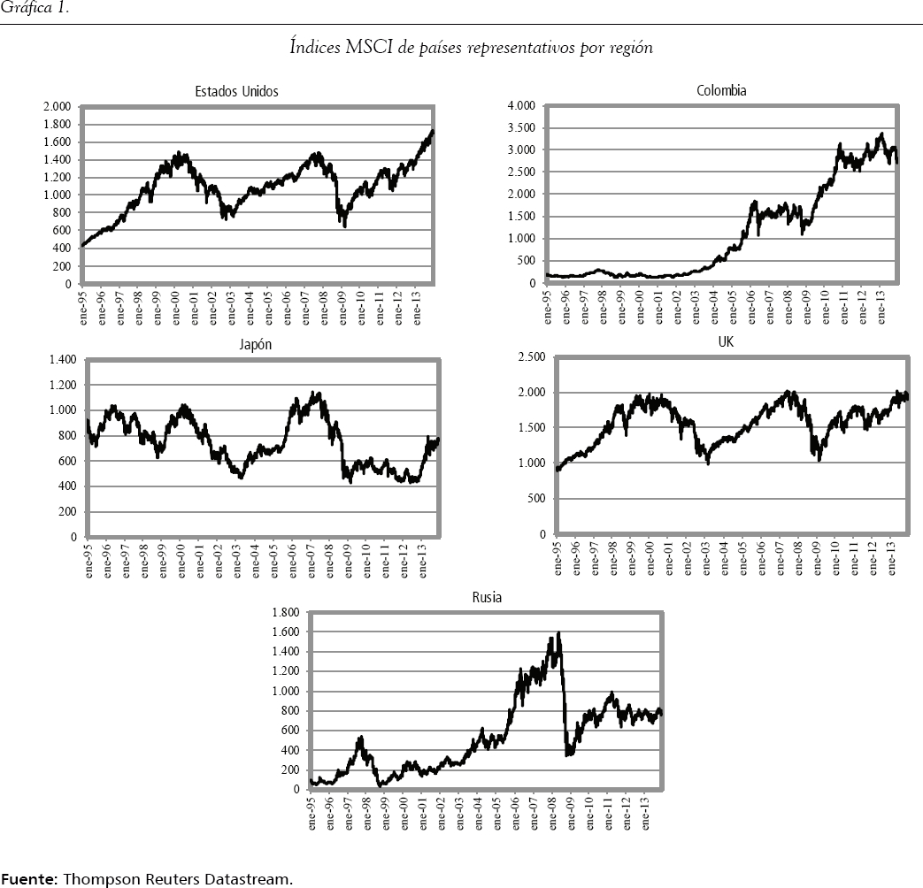 Los casos de Rusia y Colombia son un poco diferentes a los del resto de países. Antes del 2000 Colombia no tenía un mercado financiero definido y contaba con tres bolsas regionales diferentes. Solo en el 2001 se unieron estas y formaron una sola bolsa de valores, la Bolsa de Valores de Colombia (BVC); como se puede ver en la gráfica 1, desde ese entonces el mercado ha tenido un crecimiento exponencial. No obstante, este mercado sigue presentando problemas como concentración, baja liquidez del mercado y altas dependencias asintóticas (Martínez, 2008; Uribe y Fernández, 2014b; Uribe, Mosquera y Restrepo, 2013; Uribe, 2007). El efecto de las crisis financieras en Colombia no parece haber sido particularmente pronunciado ni persistente, ya que tal mercado además presentó un crecimiento acelerado en épocas posteriores. Rusia, por el contrario, presentó un gran crecimiento en las épocas previas a la crisis y, asimismo, registró una caída importante en el índice con posterioridad.
