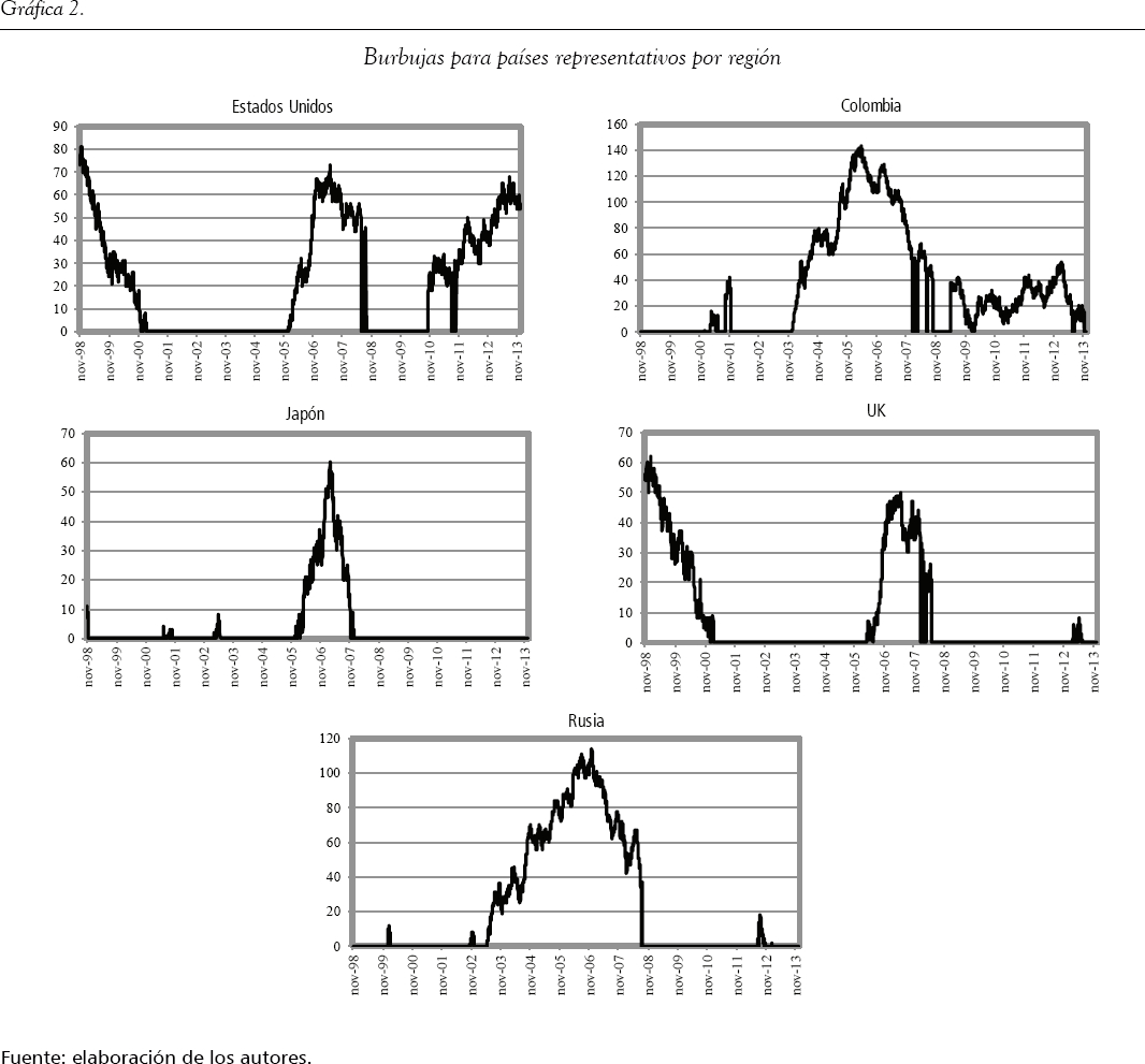A partir de la gráfica 2 se puede concluir que existen periodos de burbujas comunes entre los países, en especial para el periodo de la burbuja sub-prime. Colombia, Rusia y Estados Unidos albergan periodos de crecimiento explosivo mayores a la de los demás países. Esto es especialmente cierto para Rusia, que presenta un proceso de marcado crecimiento explosivo desde el 2002, mucho antes de que iniciara un proceso análogo en Colombia, en el 2004.