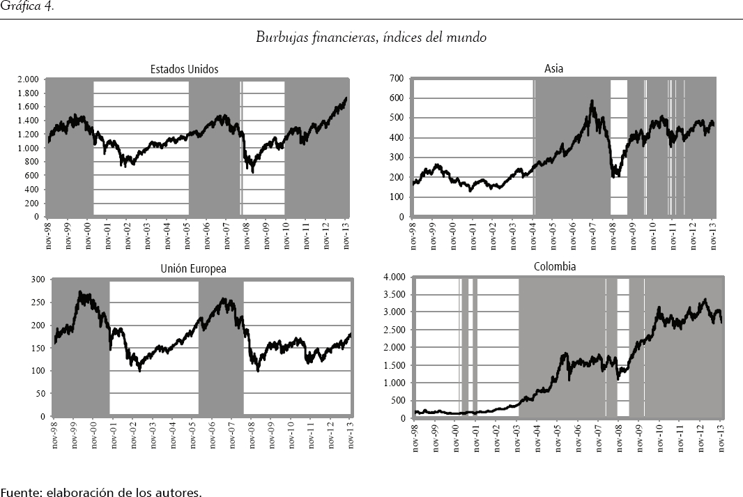La gráfica 3 contrasta cada una de las burbujas que se presentan en el mercado, en el tiempo analizado para los principales mercados regionales y para Colombia. Lo primero que se puede notar es que los resultados son coherentes con las teorías propuestas por Caballero, Farhi y Gourinchas (2008, 2009) sobre las crisis financieras. Los autores en mención argumentan que posterior a las crisis financieras en los países desarrollados (burbuja punto-com y crisis de Rusia), los flujos de capital migraron hacia economías con retornos más altos a la inversión. Así, estas economías sufrieron un crecimiento hasta el punto donde se agotaron las oportunidades de mercado. Dada la falta de desarrollo del mercado en estas regiones, estos capitales migraron de nuevo a las economías desarrolladas en busca de instrumentos financieros con mayor liquidez.
