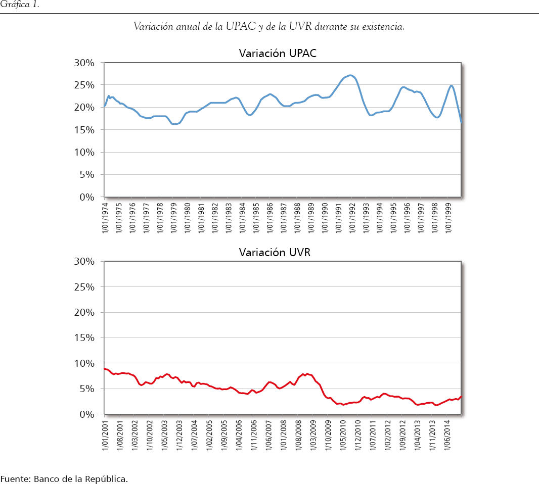 Tras el colapso de la UPAC en 1999 el Congreso de la República estableció la Unidad de Valor Real (UVR), que al igual que la UPAC, tiene como objetivo realizar una corrección monetaria y ajustar el valor de los créditos de acuerdo con el costo de vida del país. Su evolución está ligada a la evolución del IPC y es certificada por el Banco de la República, por lo que más que un cambio en el sistema, se retornó a la idea que concibió la UPAC. La gráfica 1 ilustra la evolución de ambas unidades.