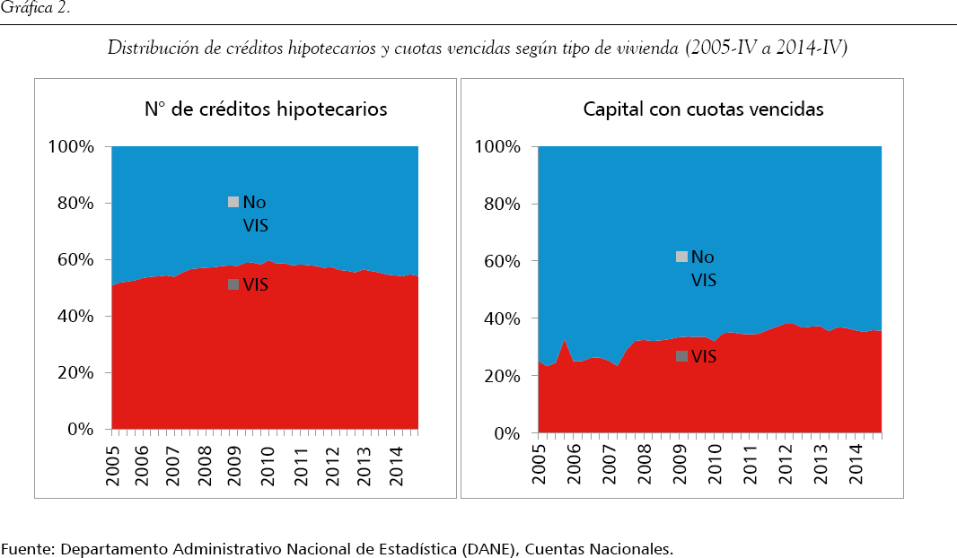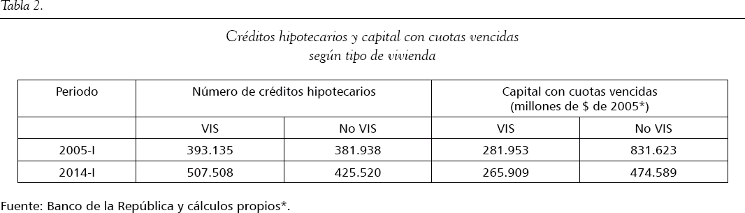 Como se observa en la tabla 2, el número de créditos hipotecarios creció signifi cativamente entre 2005 y 2014, especialmente en el caso de benefi ciarios de VIS. Por su parte, el capital con cuotas vencidas disminuyó en ambos rangos de vivienda. Se destaca la importancia de la vivienda VIS, en cuanto al número de créditos hipotecarios, que representan cerca del 55% del total en el primer trimestre de 2014, mientras que el capital con cuotas vencidas representó el 36%. No obstante, la participación VIS en el capital con cuotas vencidas ha crecido levemente (gráfica 2), lo que podría agravarse en épocas de recesión económica.