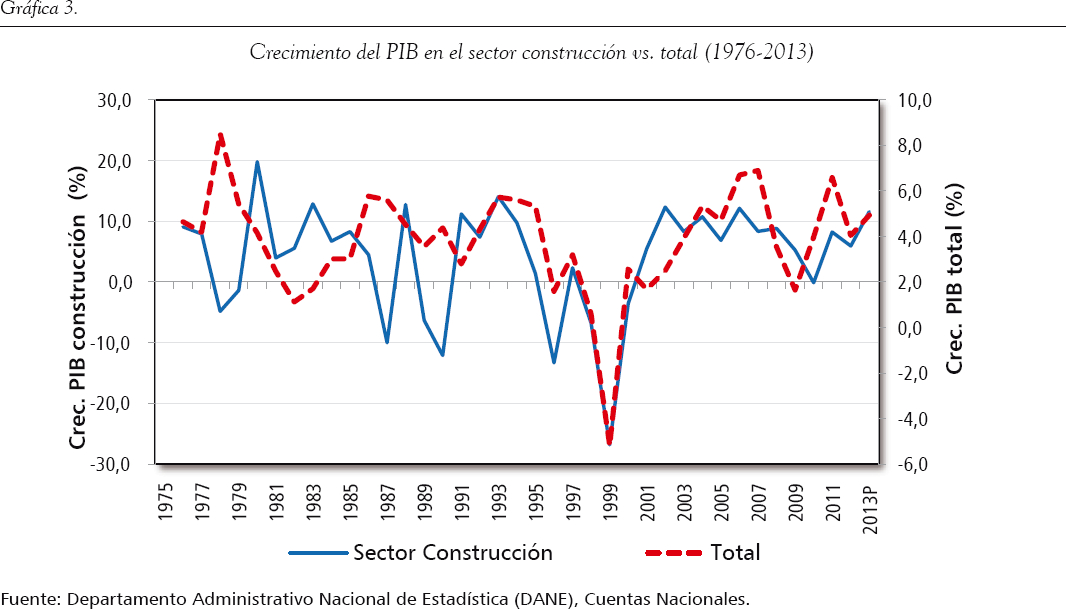 La gráfica 3 indica un comportamiento contracíclico del sector de la construcción hasta principios de la década de los noventa; los periodos de alto crecimiento económico se asociaron con caídas en el sector de la construcción. Dicha caída es particularmente notoria en 1978 (-4,8%), precisamente cuando la economía colombiana presentó tasas de crecimiento de 8,5%, las más altas de su historia, fruto, entre otros elementos, de la política de sustitución de importaciones y la bonanza cafetera.