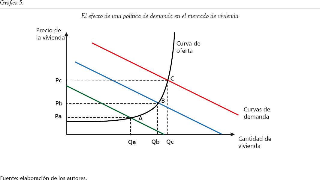 Consideremos cambios en la curva de demanda, que pueden estar asociados a políticas de fomentos al crédito o subsidios a la tasa de interés. Un desplazamiento de la demanda del punto A al punto B implica mayores ingresos para los propietarios de la tierra, pues eleva los precios de esta; un desplazamiento de la demanda del punto B al punto C genera incrementos aún mayores en los precios, pero no afecta la cantidad de vivienda en el mercado. El paso del punto A al B caracteriza lo acaecido durante el siglo XX, cuando la oferta de la tierra aún no era tan inelástica; el paso del punto B al punto C caracteriza lo ocurrido en las últimas dos décadas debido al agotamiento de la tierra y al uso ineficiente de la misma. Por lo tanto, una política de demanda en este contexto termina generando incremento en los precios, sin afectar significativamente la cantidad de vivienda y agravando la desigualdad del ingreso a favor de los oferentes.
