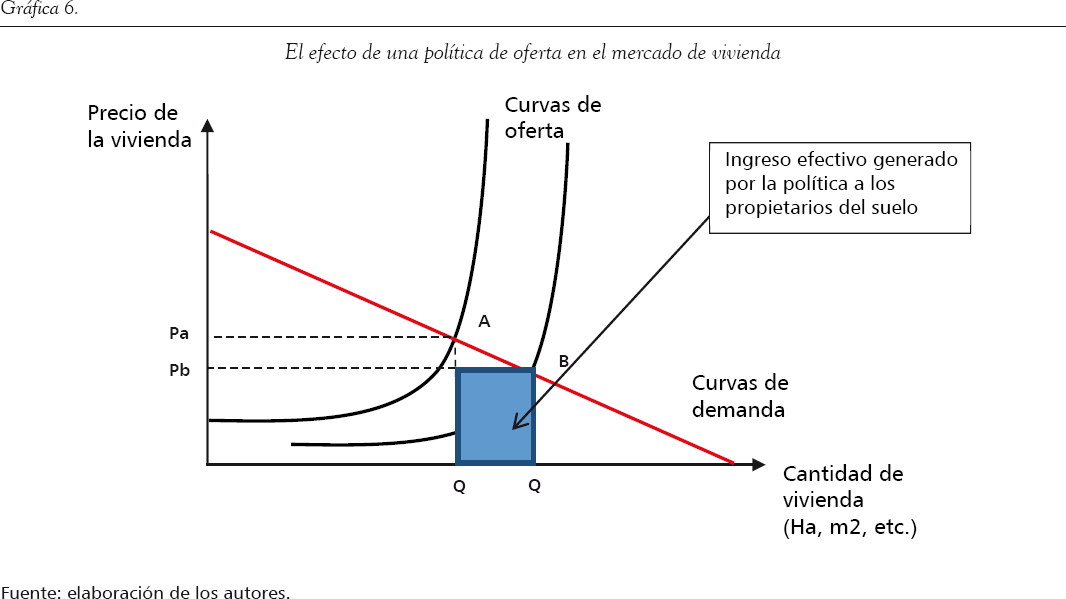 La gráfica 6 ilustra el mismo mercado, en este caso caracterizando una política de oferta mediante el uso eficiente de la vivienda existente. Construir vivienda "hacia arriba" (mejoramiento de vivienda existente bajo criterios de eficiencia urbana) permite expandir la oferta de vivienda, al reducir los precios de esta, pero favoreciendo el ingreso de los propietarios del suelo (existente).