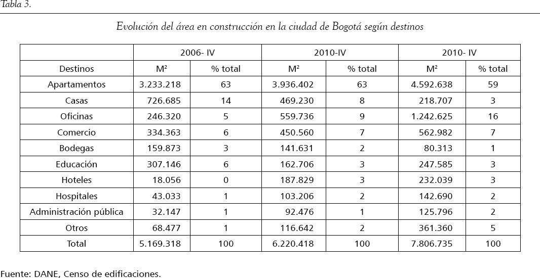 Una aproximación a la composición de la vivienda en Bogotá permite vislumbrar algunos hechos recientes en torno al mercado, así como marcar algunos elementos inherentes a la problemática actual. La tabla 3 presenta información sobre la evolución del área en construcción según destino de uso en Bogotá.
