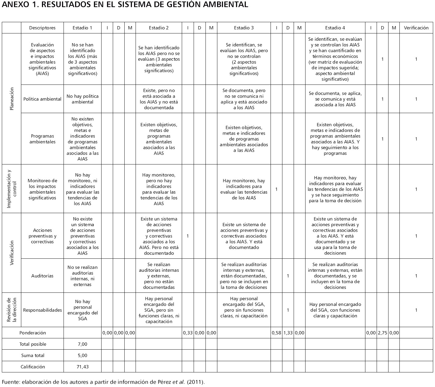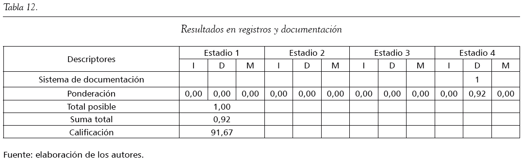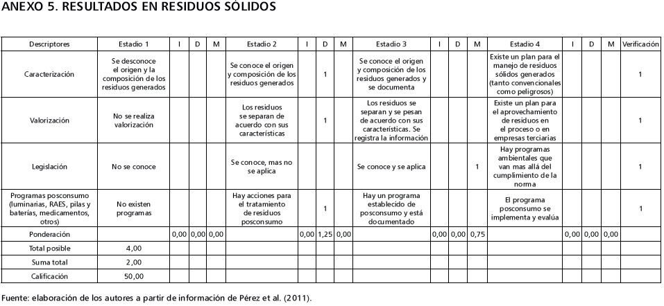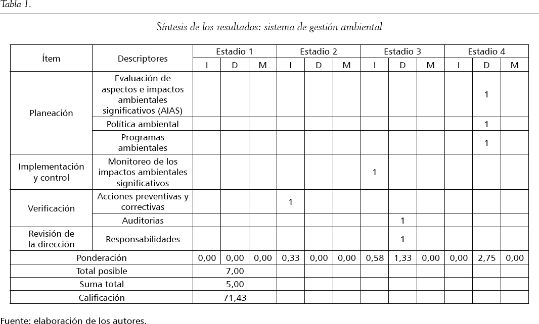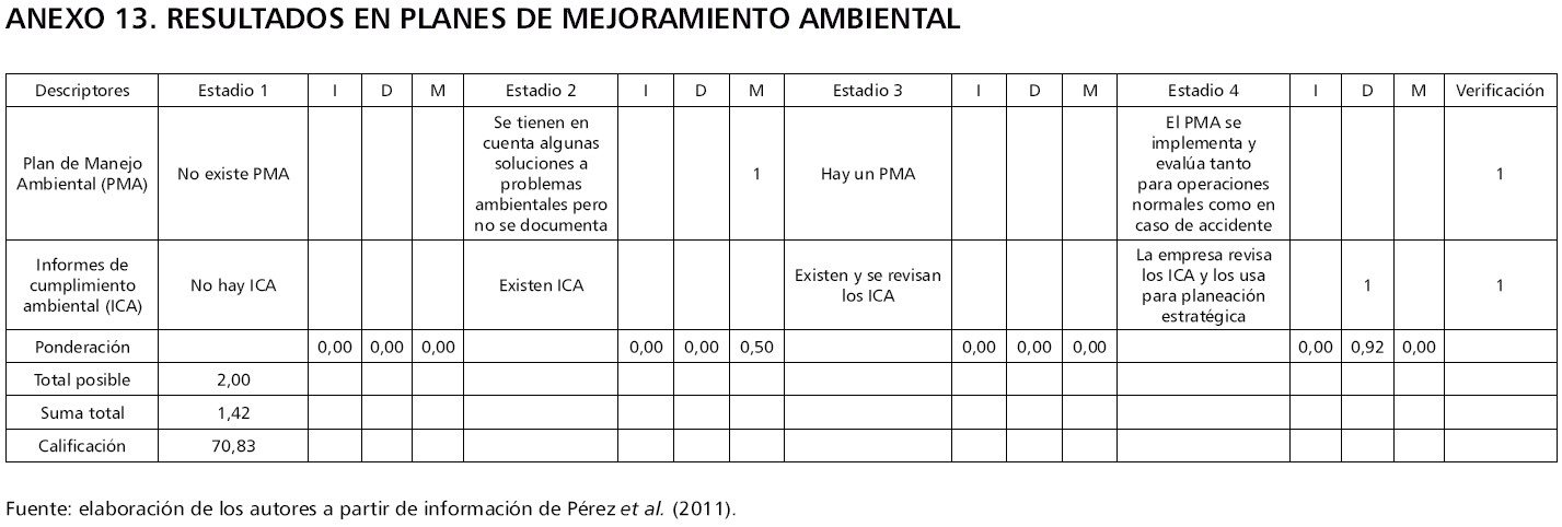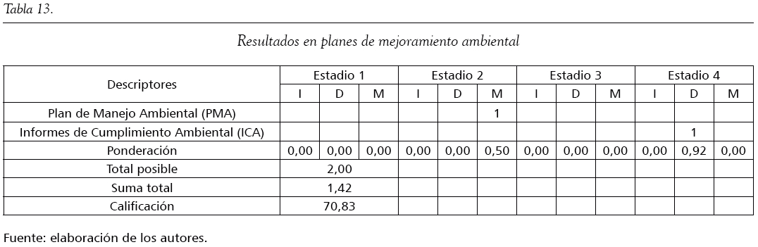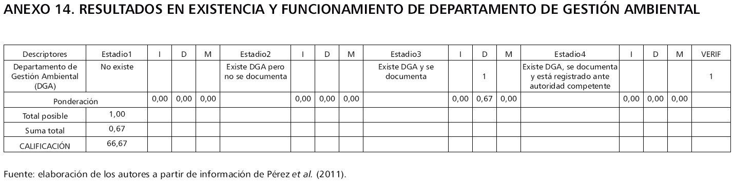 Cada una de estas variables contiene un conjunto de descriptores o indicadores que permite localizar la organización en uno de los cuatro estadios, donde el estadio 1 representa el de menor nivel de crecimiento, y el estadio 4, el de mayor nivel de crecimiento. A su vez, cada estadio se encuentra subdividido en tres posibles niveles: iniciando (I), desarrollándose (D) y madurando o en maduración (M). La evaluación a partir del modelo MMGO permite ubicar a las empresas en estadios de acuerdo con la calificación obtenida, que va de 0 a 100. Una vez obtenidos los resultados por cada una de las variables que incorpora el MMGO al componente de gestión ambiental, se identifican los resultados globales, y a partir de ellos se pueden gestionar planes, programas y acciones de mejora de acuerdo con las prioridades establecidas. Las síntesis de los resultados, conforme a las variables descritas, se recopilan en las tablas 1 a 14, en tanto la información detallada de la aplicación de la matriz aparece en los anexos del artículo.