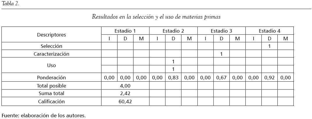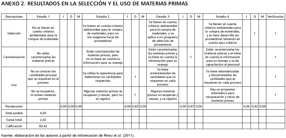 Por otro lado, las empresas tienen en cuenta aspectos ambientales para la adquisición de materias primas y han empezado a considerar sus características a la hora de darles uso; sin embargo, muestran falencias en cuanto a las cantidades que deben ser adquiridas, ya que estas se determinan según la experiencia, y aunque algunas son reusadas, estos procesos de recuperación no se documentan. La calificación es de 60,42 (tabla 2).