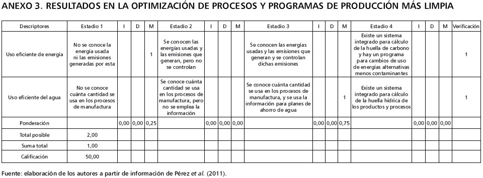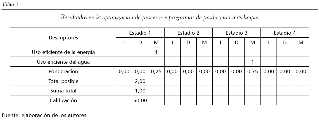 Respecto a la optimización de procesos y la producción más limpia, las empresas desconocen la cantidad de energía eléctrica que usan para la elaboración de sus productos, así como la contaminación causada por sus emisiones; no obstante, sí conocen la cantidad de agua utilizada en los procesos de manufacturación y emplean esta información para promover planes de ahorro del líquido. La calificación obtenida es de 50,00 (tabla 3).