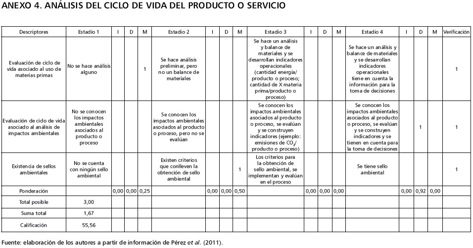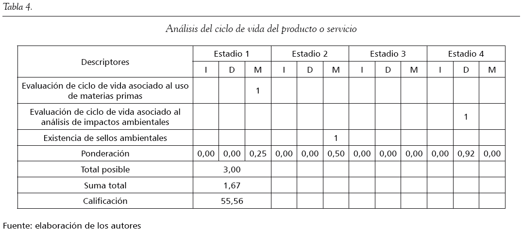 Por otro lado, en relación con la variable ciclo del producto, las empresas no llevan a cabo ningún tipo de análisis del uso de materias primas durante el proceso de manufacturación; no obstante, conocen los impactos ambientales que se generan tras la elaboración de productos, lo que ha contribuido al desarrollo de métodos de identificación con criterios que les permite la obtención de un sello ambiental. La calificación es 55,56 en esta variable (tabla 4).