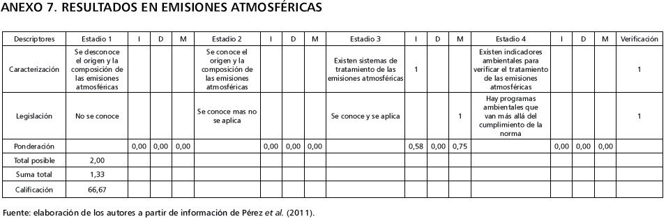 Ahora bien, en la variable emisiones atmosféricas es posible evidenciar que las empresas poseen un sistema para el control y tratamiento de las emisiones contaminantes de la atmósfera; este proceso está aún en fase inicial y busca ajustarse a la normatividad legal. La calificación es 66,67 (tabla 7).