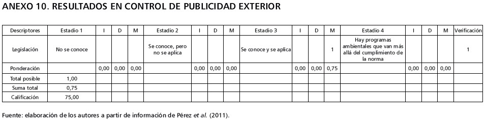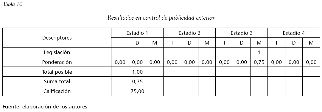 En la variable publicidad exterior visual, las empresas conocen y aplican la normatividad legal en cuanto al uso de publicidad excesiva y la contaminación visual que esta causa. La calificación es 75,00 en esta variable (tabla 10).