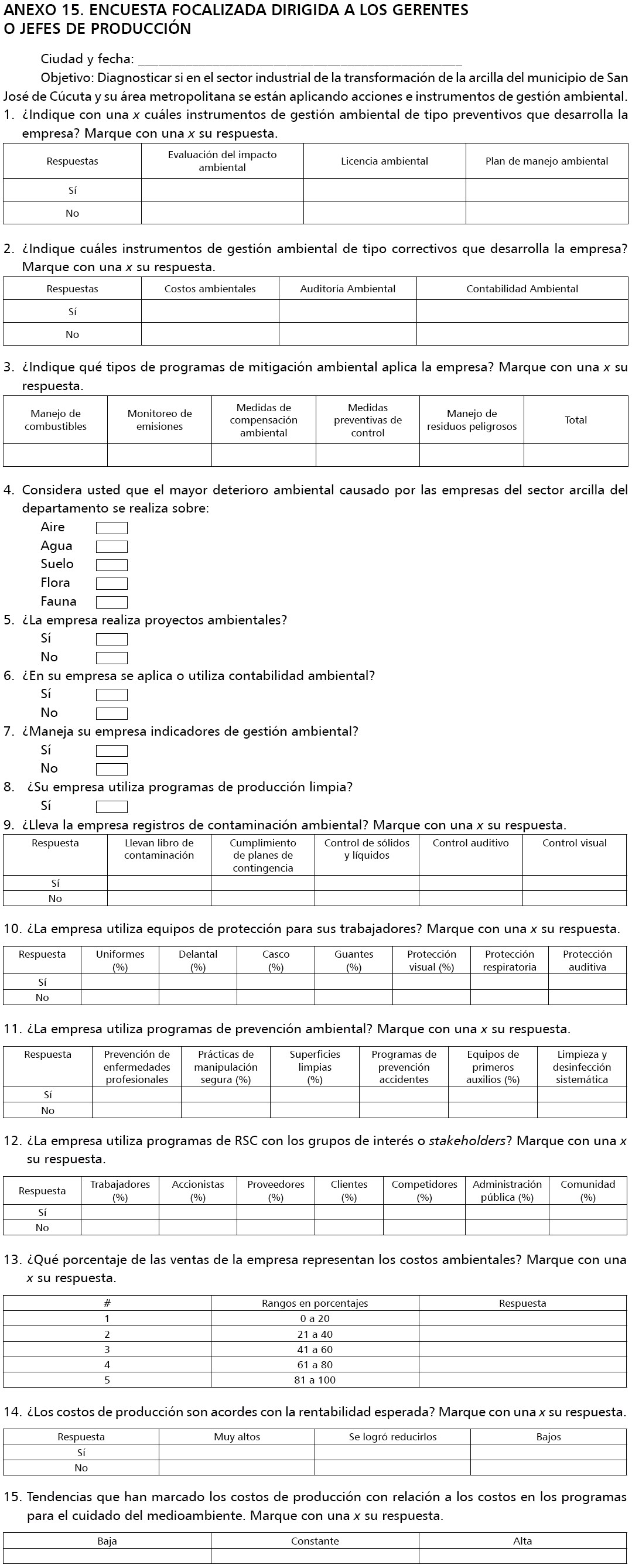 La recolección de la información se realizó a través de la aplicación de una encuesta de 15 preguntas (Anexo 15) a los gerentes o jefes de producción de estas empresas1. En ella se incluyeron las siguientes variables: instrumentos de gestión ambiental preventivos y correctivos; programas de mitigación ambiental aplicados; perspectiva en torno al impacto ambiental de las empresas sobre el medioambiente y los recursos; diseño y desarrollo de proyectos ambientales; uso de la contabilidad ambiental; manejo de indicadores de gestión ambiental; programas de producción limpia; actualización de registros; uso de equipos de protección; uso de programas de prevención ambiental; programas dirigidos al bienestar de los grupos de interés y costos ambientales.