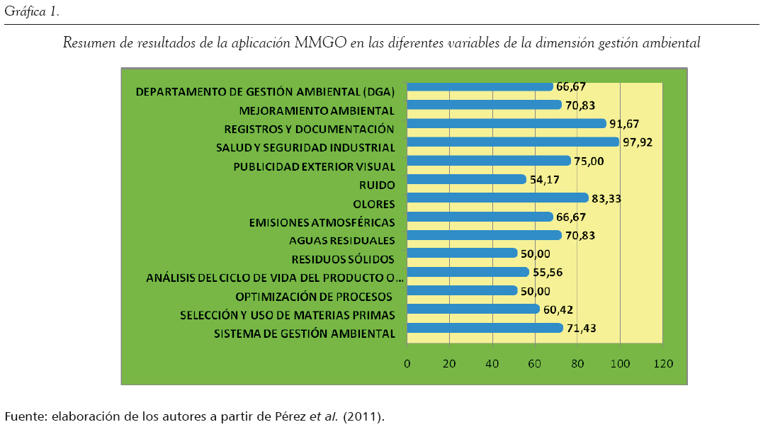 La información recolectada fue sistematizada e incluida de forma global en el componente de gestión ambiental del Modelo de Modernización para la Gestión de Organizaciones (MMGO) de la Universidad EAN. En este sentido, mencionan Pérez et al. (2011) que el MMGO2 ha sido implementado en más de 150 empresas, con el fin de hacer un análisis situacional basado en un enfoque sistémico y holístico. El MMGO incluye la valoración de diversos componentes como gestión del conocimiento, direccionamiento estratégico, cultura organizacional y gestión ambiental. Según Aguirre (2012), el componente de la gestión ambiental evalúa estas variables: