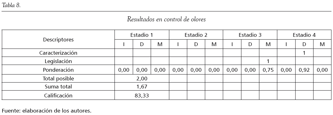 Además, las empresas poseen un sistema para el control y la supresión de olores. Sus indicadores permiten evaluar su efectividad y están ajustados a la normatividad legal, aunque su acción solo se limita a lo establecido por la ley. La calificación es 83,33 (tabla 8).