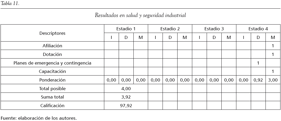 En la variable salud y seguridad industrial, las empresas se preocupan por la seguridad y el bienestar de sus empleados dentro y fuera de las instalaciones. Aparte de lo establecido por ley, en cuanto a salud, pensión, dotación y riesgos profesionales, las compañías procuran implementar programas de control, prevención y capacitación en riesgos y emergencias, para que sus empleados se desempeñen de manera óptima y eficaz en sus distintos puestos de trabajo. El seguimiento a los programas de seguridad y capacidad empresarial arrojan buenos resultados. La calificación es 97,92 (tabla 11).