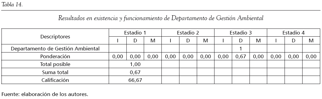 Por último, se evidencia que las empresas han instituido departamentos encargados de velar por la salvaguarda del medioambiente. A medida que pasa el tiempo, estos se fortalecen; de hecho, se encuentran en una etapa de desarrollo hacia su consolidación como mediadores, protectores y controladores de los aspectos industriales que afecten de forma negativa el entorno ecológico de la empresa. La calificación de la variable Departamento de Gestión Ambiental es 66,67 (tabla 14).